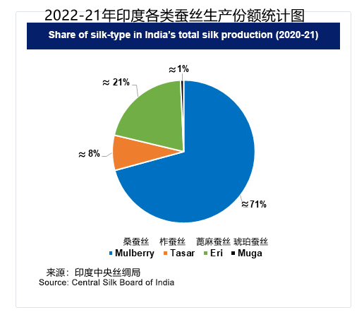 印度是世界第二大蠶絲生產(chǎn)國。該國的農(nóng)村和半城市化地區(qū)有約976萬人從事蠶桑行業(yè)。該產(chǎn)業(yè)是印度最大的外匯收入來源之一。蠶?;顒臃植荚谟《?2360個村莊中。印度共生產(chǎn)四類天然蠶絲:桑蠶絲,蓖麻蠶絲,柞蠶絲和琥珀蠶絲,用以制作絲綢服裝,制成品,面料,紗線,地毯,披肩,圍巾,靠墊套和配飾等。