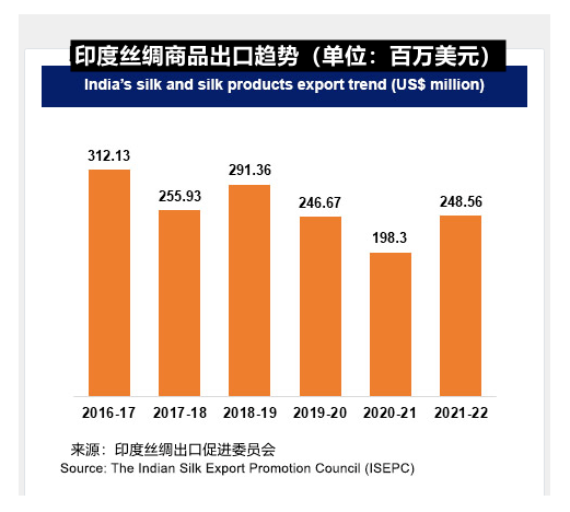 印度對外出口生絲、真絲紗線、絲綢面料、制成品、成衣、絲下腳類和手搖制品。 2021-22 年期間,盡管面臨疫情和全球供應鏈中斷的挑戰(zhàn),其絲綢商品出口額達到 2.4856 億美元,同比增長25.3%。出口產(chǎn)品細分如下:真絲紗線出口額為52.62 千萬盧比(約660萬美元),同比增長79.2%;絲綢面料和制成品出口額為837.41 千萬盧比(約1.057 億美元),同比增長14.8%;真絲成衣出口額為671.13千萬盧比(約8470 萬美元),同比增長 49.3%;真絲地毯出口額為79.125千萬盧比(約1000 萬美元),同比下降 26.4%;絲下腳類出口額為208.67 千萬盧比(2630 萬美元),同比增長 38.5%。