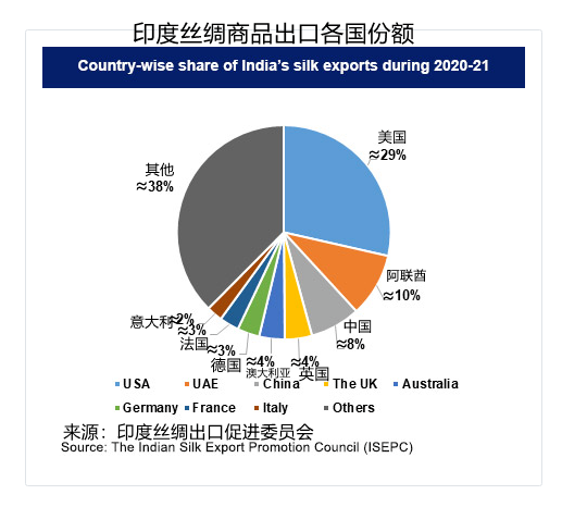 印度絲綢商品在全球需求量很大,出口至30多個國家。其最大的進口國有美國,阿聯(lián)酋,中國,英國,澳大利亞,德國,法國,意大利,西班牙,馬來西亞,尼泊爾,日本,比利時,加拿大,南非以及新加坡等等。在2020-21年度,美國是印度絲綢商品的最大進口國,所占份額29%;阿聯(lián)酋僅次于美國排名第二,份額為10%;中國,英國和澳大利亞依次緊隨其后,分別占其總出口份額的8%,4%和4%。