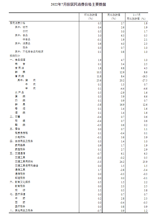 7月份,全國居民消費價格環(huán)比上漲0.5%。其中,城市上漲0.4%,農(nóng)村上漲0.5%;食品價格上漲3.0%,非食品價格下降0.1%;消費品價格上漲0.6%,服務(wù)價格上漲0.3%。