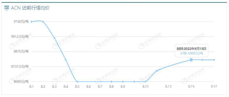 根據(jù)全球紡織網(wǎng)價(jià)格監(jiān)測(cè)顯示,丙烯腈本月價(jià)格變動(dòng)幅度減弱,8月5日?qǐng)?bào)8600元/噸,8月17日?qǐng)?bào)8800元/噸,8月主流成交參考價(jià)格至8600-9150元/噸。
