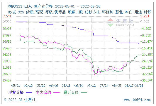 本周棉紗現(xiàn)貨行情維持弱勢,市場整體成交氛圍變化不大,紗廠去庫為主。臨近9月,產(chǎn)業(yè)鏈下游需求恢復(fù)不及預(yù)期,紡企對(duì)于原料的采購保持謹(jǐn)慎,維持隨用隨買,成品端低端紗走貨相對(duì)較好,消費(fèi)降級(jí)現(xiàn)象較明顯。坯布市場成交改善不大,目前外銷訂單未有持續(xù)好轉(zhuǎn),內(nèi)銷打樣詢價(jià)不足,旺季訂單遲遲不啟動(dòng),企業(yè)信心有所下降。本周棉紗期貨漲幅加大,26日棉紗主力2209合約結(jié)算價(jià)24400 元/噸,較上周上漲1145元/噸。