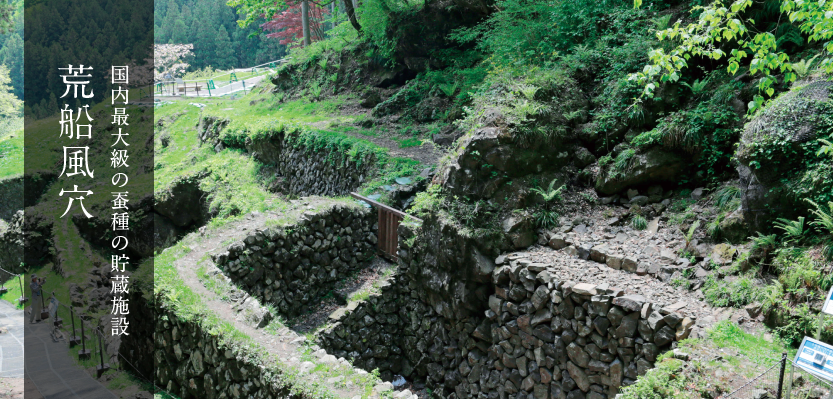 荒船風穴,蠶業(yè)自古以來飼育一年一季的春蠶。19世紀后半期起,這里開始嘗試利用即使夏天也可以吹入冷風的風穴來儲藏蠶卵(蠶種),并通過調整孵化時期,挑戰(zhàn)一年數次的養(yǎng)蠶。在高山社學習養(yǎng)蠶的庭屋千壽先生在這一帶發(fā)現了冷風吹出地后,其父靜太郎從1905(明治38)年到1914(大正3)年依靠氣象學和養(yǎng)蠶、土木專家的指導著手建設了這一蠶種儲蔵風穴?;拇L穴當時擁有著日本最大規(guī)模的蠶種儲藏力,存儲有來自國內40個都道府縣和朝鮮半島的蠶種,進而為一年數次養(yǎng)蠶和蠶繭增產做出了貢獻。富岡制絲廠推出蠶繭改良運動時,這里參與了試驗飼育用蠶種的儲藏等合作。