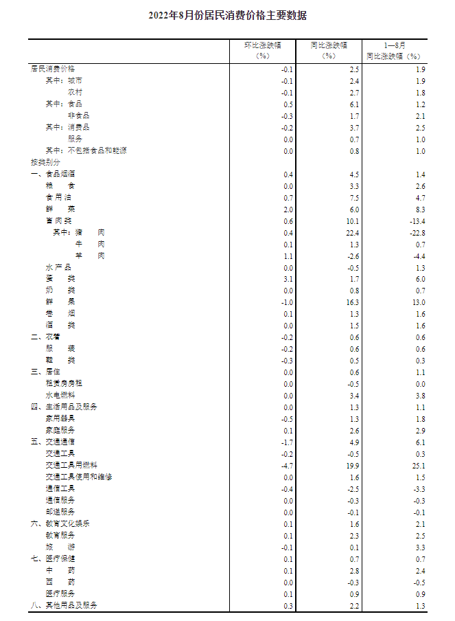 2022年8月份,全國(guó)居民消費(fèi)價(jià)格同比上漲2.5%。其中,城市上漲2.4%,農(nóng)村上漲2.7%;食品價(jià)格上漲6.1%,非食品價(jià)格上漲1.7%;消費(fèi)品價(jià)格上漲3.7%,服務(wù)價(jià)格上漲0.7%。1--—8月平均,全國(guó)居民消費(fèi)價(jià)格比上年同期上漲1.9%。