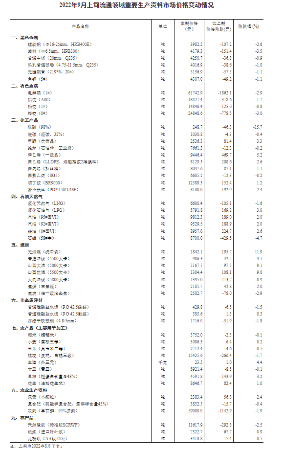 2022年9月上旬流通領(lǐng)域重要生產(chǎn)資料市場價格變動情況