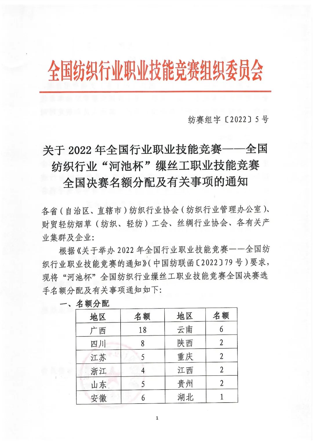 行業(yè)通知丨關(guān)于2022年全國行業(yè)職業(yè)技能競賽——全國紡織行業(yè)“河池杯”繅絲工職業(yè)技能競賽全國決賽名額分配及有關(guān)事項的通知