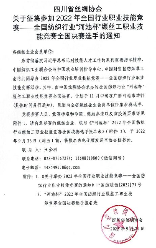 行業(yè)通知| 四川省絲綢協(xié)會(huì)關(guān)于征集參加2022年全國(guó)行業(yè)職業(yè)技能競(jìng)賽——全國(guó)紡織行業(yè)“河池杯”繅絲工職業(yè)技能競(jìng)賽全國(guó)決賽選手的通知