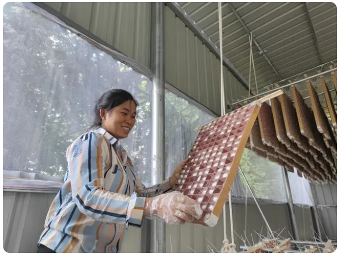 “這兩年新冠肺炎疫情讓我下定了在家創(chuàng)業(yè)的決心,聽說種桑養(yǎng)蠶賺錢快而且活不重,我在家把蠶養(yǎng)好,還能照顧家人,于是在政府的大力宣傳和本人實地考察后,我決定在我家的荒坡發(fā)展種桑養(yǎng)蠶產(chǎn)業(yè),原先我還擔(dān)心沒有技術(shù)養(yǎng)不好呢,現(xiàn)在看來‘擔(dān)心’完全是多余的,鎮(zhèn)里種桑養(yǎng)蠶專班安排技術(shù)人員來指導(dǎo),從桑苗種植、幼蠶養(yǎng)護到成蟲吐絲全程跟進,還成立微信交流群,完全可以放心。下一批,我還要擴大養(yǎng)殖,這個可比出去打工強多了,在家就能賺到錢,還能照顧家人,除了解決自家就業(yè)問題,還帶動了村里在家勞動力就業(yè)呢!心里既踏實又滿足,這都得感謝國家的好政策呀?!睂庍M剛一邊取蠶繭一邊說道。