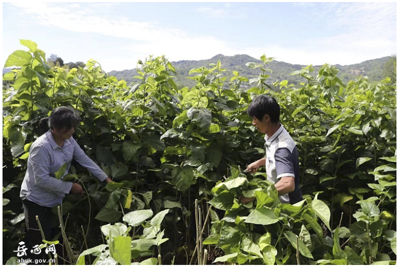 蠶農(nóng)在岳西縣蓮云鄉(xiāng)蓮塘村高產(chǎn)桑園示范基地采摘桑葉