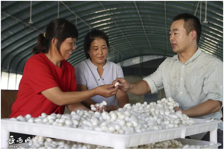 安徽省農(nóng)科院蠶??萍继嘏蓤F專家張彥(右一)在指導蠶農(nóng)挑選合格的蠶繭