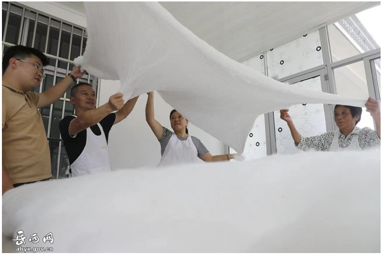 安徽省農(nóng)科院蠶??萍继嘏蓤F專家徐浩(左一)深入岳西縣蠶絲被加工企業(yè),幫助蠶農(nóng)解決生產(chǎn)中的技術(shù)問題