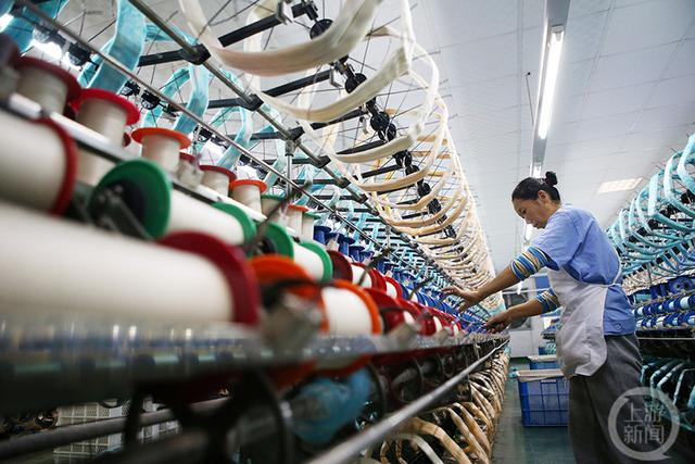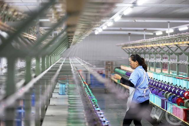 女工在生產(chǎn)車間進行絡(luò)絲勞作。