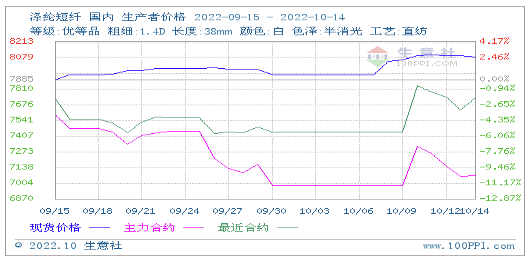 現(xiàn)貨價(jià)格:本月前兩周(10.1-10.14)國內(nèi)滌綸短纖現(xiàn)貨行情呈高開低走態(tài)勢(shì)。據(jù)生意社價(jià)格監(jiān)測顯示,10月14日國內(nèi)滌綸短纖均價(jià)報(bào)價(jià)在8085元/噸左右,較國慶前上漲2.00%,比去年同期下跌1.98%。