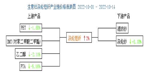 這兩周國際原油期貨價(jià)格受OPEC+擬將日產(chǎn)量削減逾200萬桶以支撐油市的影響大幅沖高,但后期對(duì)未來全球需求的持續(xù)擔(dān)憂及IMF對(duì)經(jīng)濟(jì)前景的悲觀預(yù)測油價(jià)回落,美油期貨主力兩周大漲約10.7%收于85.6美元每桶。近期國內(nèi)PTA裝置負(fù)荷有所提升,后續(xù)有新裝置投產(chǎn)預(yù)期,庫存壓力增加,下游開工負(fù)荷相比往年處于低位,整體表現(xiàn)旺季不旺,對(duì)原料需求雖所有改善但整體仍然偏弱,油價(jià)上漲帶動(dòng)PTA期貨小漲。國慶節(jié)后乙二醇國內(nèi)整體開工負(fù)荷上升,下游需求不溫不火,乙二醇價(jià)格承壓走弱。國慶假期短纖產(chǎn)銷放量,庫存下降推動(dòng)價(jià)格上漲,隨著前期檢修裝置計(jì)劃重啟,開工預(yù)期提升,價(jià)格回落。下游近期開工變化不大,純滌紗和滌棉紗市場價(jià)格相對(duì)穩(wěn)定,整體交投一般,促銷出貨為主,以非新疆溯源及再生訂單詢價(jià)為主。