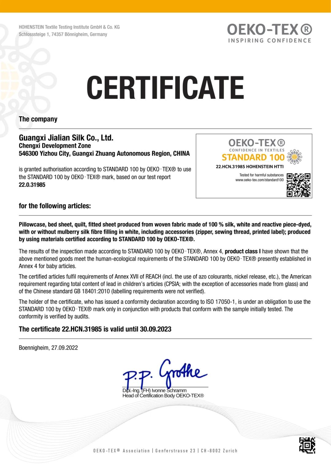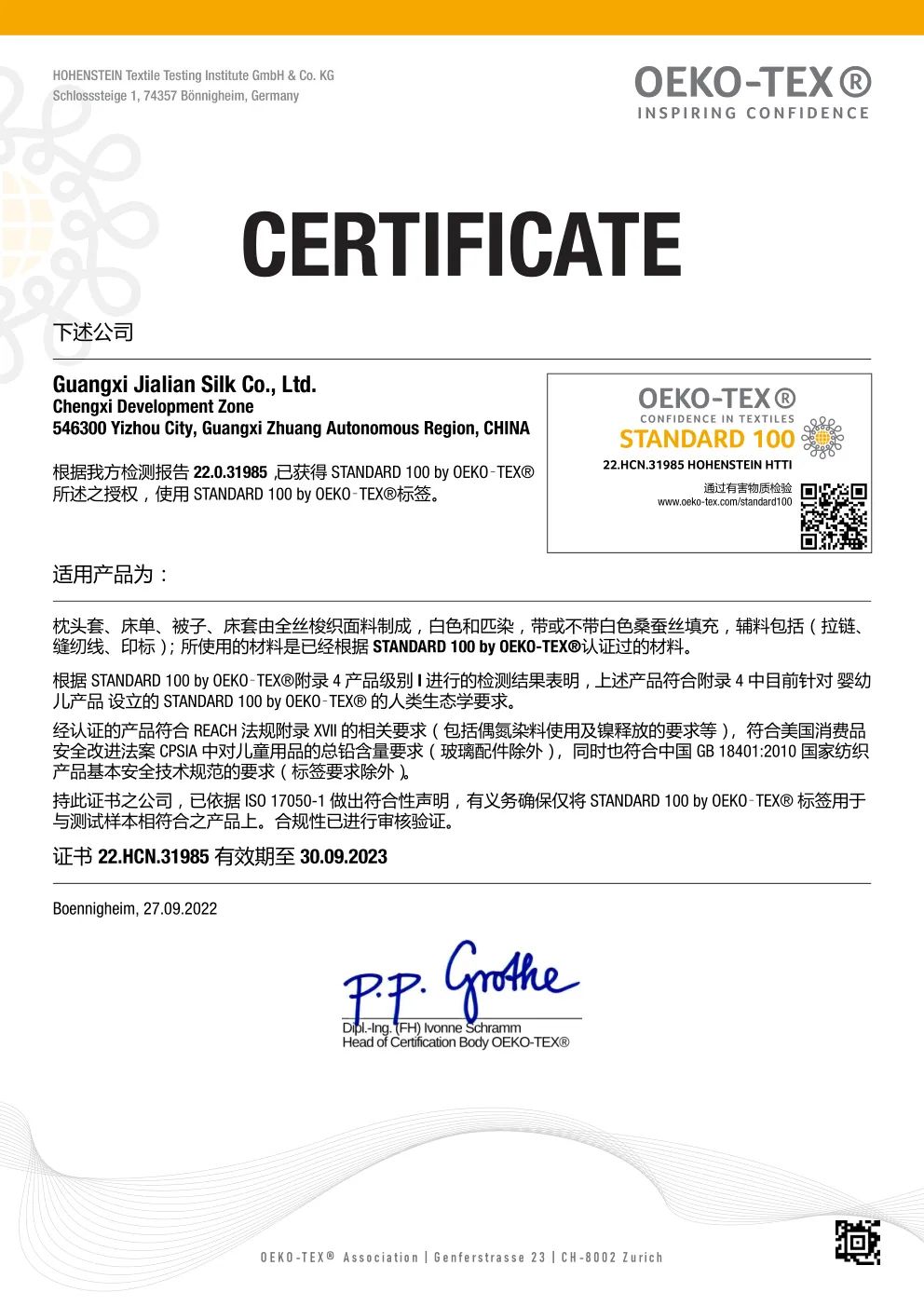 2022年10月,廣西嘉聯(lián)絲綢股份有限公司“南方絲巢”家紡產(chǎn)品成功通過(guò)“STANDARD 100 by OEKO-TEX”國(guó)際生態(tài)紡織品認(rèn)證,符合STANDARD 100認(rèn)證中最嚴(yán)格等級(jí)——I級(jí)嬰幼兒產(chǎn)品級(jí)別要求。德國(guó)海恩斯坦實(shí)驗(yàn)室根據(jù)STANDARD 100檢測(cè)標(biāo)準(zhǔn)對(duì)“南方絲巢”系列產(chǎn)品進(jìn)行了300多種有害物質(zhì)檢測(cè),充分驗(yàn)證其產(chǎn)品的高品質(zhì)與安全性。