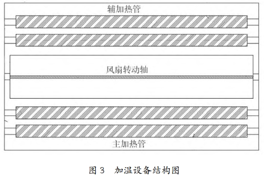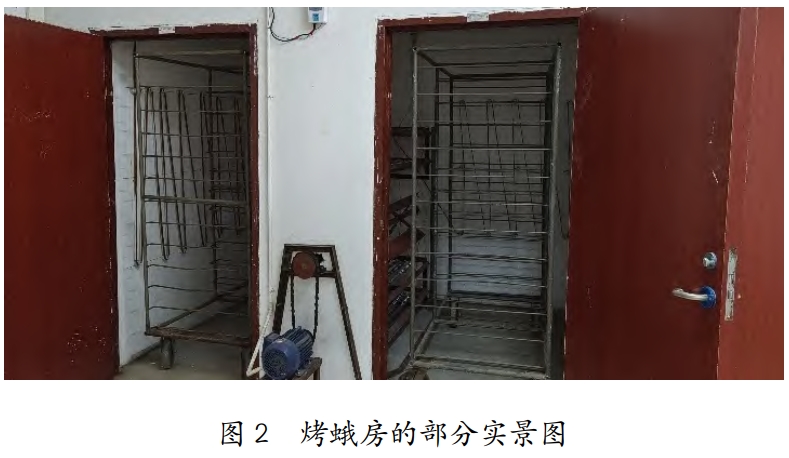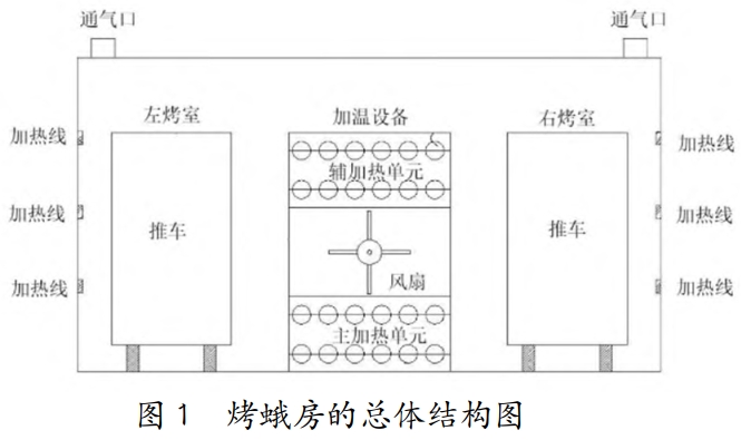 烤室設(shè)計(烤蛾房共有2個左右連通的用于放置推車的房間,烤室墻面均勻布置加溫線,與推車高度相等;左右烤室布置有溫度傳感器,上方分別設(shè)置兩個排風(fēng)通氣口??臼业募訜峋€增加了若干個加溫點,線覆蓋的高度與推車高度平齊,使升溫速度提高,推車多面受熱均勻:連接的溫度傳感器迅速感應(yīng)室內(nèi)溫度,以達(dá)到合理控溫的效果。熱量從通氣口進(jìn)行交換,減少熱損失,達(dá)到排氣換氣的效果。)加溫設(shè)備(由下層的主加熱管單元、上層的輔加熱管單元以及中間的風(fēng)扇組成加溫設(shè)備。)