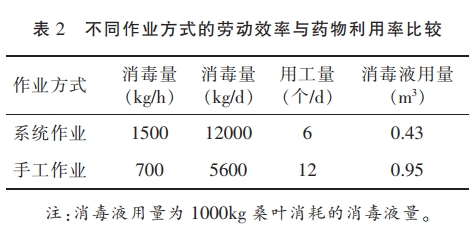 桑葉全程消毒系統(tǒng)還可對蠶箔、給桑架和蠶網(wǎng)進(jìn)行浸泡消毒,1h浸泡蠶箔600個、給桑架350個、蠶網(wǎng)1500根,蠶網(wǎng)浸泡甩干后可直接使用。桑葉全程消毒系統(tǒng)具有穩(wěn)定性好、作業(yè)效率高、人體危害小、藥物利用率高等優(yōu)點,使用該系統(tǒng)可以做到桑葉消毒工作標(biāo)準(zhǔn)化、規(guī)范化、精細(xì)化,同時可以兼顧其他部分蠶具消毒,適合在蠶種生產(chǎn)行業(yè)中推廣應(yīng)用。