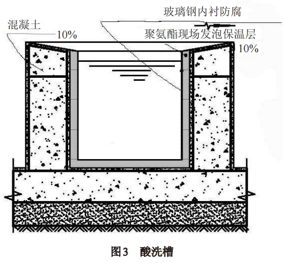 鹽酸系統(tǒng):設(shè)置有2個容量為10t的鹽酸罐,1個容積為5m3的臨時鹽酸罐,3個罐體均位于浸酸車間2樓。此設(shè)計可以充分利用鹽酸的液面差,在使用時直接開閥門,鹽酸即可流入酸槽。