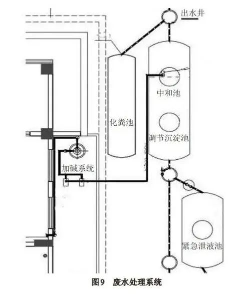 廢水處理系統(tǒng):主要由緊急泄液池、調(diào)節(jié)沉淀池、中和池、化糞池、加堿系統(tǒng)以及各路廢水管道網(wǎng)組成。福爾馬林槽、酸槽、水槽中廢液以及清洗車間的廢水通過排污管排入調(diào)節(jié)沉淀池,經(jīng)過沉淀靜置,再排到中和池,在中和池中廢液與堿液發(fā)生酸堿中和反應(yīng),經(jīng)檢驗合格后排入市政管道。