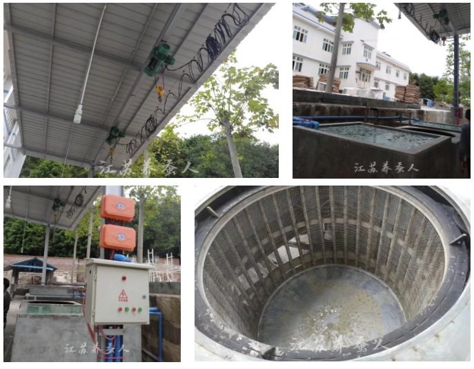 1. 桑葉浸泡(將未消毒桑葉裝入消毒簍中,運送至消毒區(qū),由電動葫蘆將消毒簍提升到消毒池中,浸漬8~10min,在3min和6min各提升1次,排出桑葉中的氣泡。)