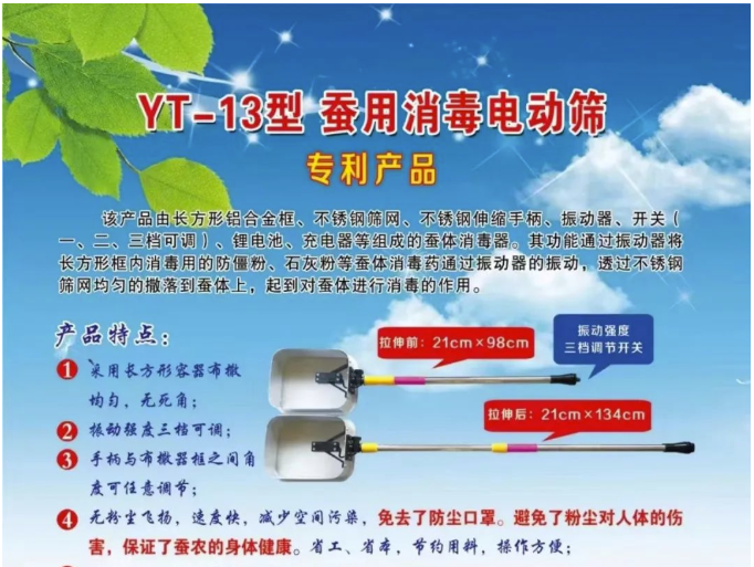將防僵粉、石灰等蠶體蠶座消毒藥劑放入篩里,通過振動器的振動,透過不銹鋼篩網(wǎng)均勻地撒落在蠶體上,起到對蠶體蠶座消毒的作用,撒藥速度是人工操作的2倍左右,彌補了人工撒藥不均勻和速度慢的缺陷。