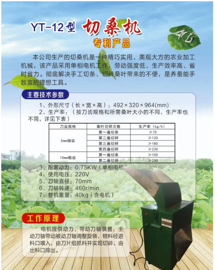電機提供動力帶動刀軸裝置,主動刀軸帶動被動刀軸調(diào)整旋轉(zhuǎn),桑葉經(jīng)進(jìn)料口喂入,由刀片抓料并實現(xiàn)切碎,由出料口排出。家蠶2齡起用葉量多時用切桑機切葉生產(chǎn)效率高,省時省力,切葉速度是手工切葉的3~4倍,徹底解決了手工切桑葉費時、費力的問題。