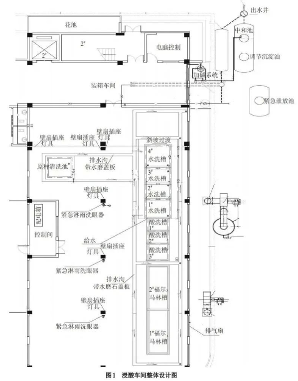 廣西壯族自治區(qū)蠶業(yè)技術(shù)推廣總站蠶種浸酸車間為南北走向,長39m,寬15m,車間內(nèi)設(shè)計有控制間、空中軌道操作系統(tǒng)、福爾馬林槽、酸洗槽、水洗槽、廢水處理系統(tǒng)、廢氣處理系統(tǒng)、緊急淋雨系統(tǒng)、晾種室、裝箱車間等。各組成部分按照蠶種出庫、浸酸的工序(蠶種出庫→室溫散冷0.5h→福爾馬林浸泡20min→撈出瀝干→浸酸→設(shè)定目的溫度與比重→出浸酸缸→清水逐級漂洗→晾干)來進(jìn)行設(shè)計。在提高工作效率的基礎(chǔ)上,既考慮工序流水作業(yè)的科學(xué)性,也充分考慮造價成本,是目前國內(nèi)規(guī)模最大的浸酸車間之一。