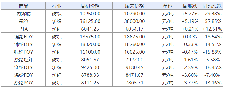 從上面的化纖榜單可以看出,當(dāng)周化纖產(chǎn)品漲跌各不同,其中丙烯腈、氨綸價格漲勢搶眼,滌綸表現(xiàn)卻不盡如人意。具體來看: