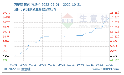 10月國內(nèi)丙烯腈市場行情持續(xù)上漲,截至21日國內(nèi)丙烯腈現(xiàn)貨市場價格在10790元/噸,周漲幅5.27%。近期原料丙烯價格有所回落,成本端支撐減弱。但丙烯腈行業(yè)開工率整體穩(wěn)定在6~7成,安慶石化月底計(jì)劃停車檢修,供應(yīng)面偏緊預(yù)期,加之下游剛需支撐,使得丙烯腈工廠挺價意愿較強(qiáng),主流企業(yè)10月掛牌價上調(diào),預(yù)計(jì)短期內(nèi)丙烯腈行情仍將小幅上行。