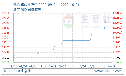 10月以來,國內(nèi)氨綸市場維持上行走勢,截止10月21日40D規(guī)格市場均價為38000元/噸,周漲幅5.19%。開工在7成附近,也有部分暢銷規(guī)格型號庫存低位,氨綸廠家報盤上漲。成本方面,原料PTMEG受成本BDO高位支撐,且新疆地區(qū)運(yùn)輸偏緩,市場挺價為主;純MDI市場現(xiàn)貨偏緊,貿(mào)易商惜售,因此氨綸成本利好支撐不減。但下游終端客戶需求跟進(jìn)謹(jǐn)慎、按需采買,持觀望心態(tài)。綜合來看,短期氨綸市場看漲情緒仍存。