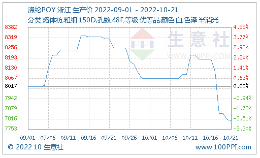 據(jù)生意社監(jiān)測,2022年第42周(10.17-10.21)大宗商品價格漲跌榜中化纖板塊環(huán)比上升的商品共有3種,分別為丙烯腈(5.27%)、氨綸(5.19%)、PTA(0.21%)。環(huán)比下降的商品共有6種,跌幅前3的產(chǎn)品分別為滌綸POY(-3.77%)、滌綸FDY(-3.60%)、滌綸DTY(-2.59%)。
