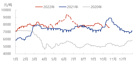 圖1 滌綸長(zhǎng)絲POY150/48主流市場(chǎng)價(jià)格走勢(shì)圖