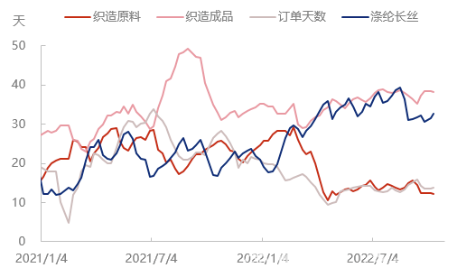 隆眾資訊統(tǒng)計(jì),截至10月20日,滌綸長(zhǎng)絲POY工廠庫(kù)存在31.3天,環(huán)比+5.03%;FDY工廠庫(kù)存在31.1天,環(huán)比+2.30%;DTY庫(kù)存在38.7天,環(huán)比+2.93%。上周雖滌綸長(zhǎng)絲工廠產(chǎn)銷(xiāo)略有好轉(zhuǎn),但多數(shù)時(shí)間產(chǎn)銷(xiāo)清淡,滌綸長(zhǎng)絲企業(yè)成品庫(kù)存進(jìn)一步累積。
