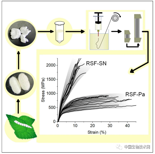 重紡蠶絲的性能超過天然蠶絲,視其溶解方式不同而有所區(qū)別。研究人員發(fā)現(xiàn),在沒有拉伸的情況下,這些重紡蠶絲的平均受力(高達(dá)2吉帕斯卡)比天然蛛絲(0.9至1.4吉帕斯卡)高出70%。其楊氏彈性模量(拉伸模量)高于所有天然絲,說明它的堅硬性能超過彈性。