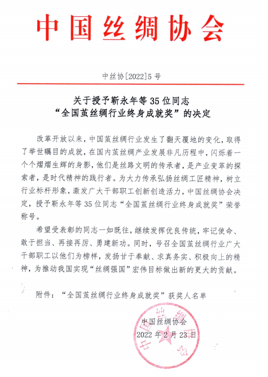 改革開放以來,中國繭絲綢行業(yè)發(fā)生了翻天覆地的變化,取得了舉世矚目的成就,在國內(nèi)繭絲綢產(chǎn)業(yè)發(fā)展非凡歷程中,閃爍著一個(gè)個(gè)熠熠生輝的身影,他們是絲路文明的傳承者,是產(chǎn)業(yè)變革的探索者,是時(shí)代精神的踐行者。為大力傳承弘揚(yáng)絲綢工匠精神,樹立行業(yè)標(biāo)桿形象,激發(fā)廣大干部職工創(chuàng)新創(chuàng)造活力,中國絲綢協(xié)會(huì)決定,授予靳永年等 35 位同志“全國繭絲綢行業(yè)終身成就獎(jiǎng)”榮譽(yù)稱號(hào)。