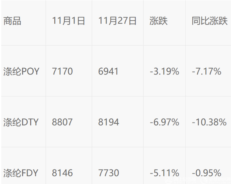 11月,國(guó)內(nèi)滌綸長(zhǎng)絲市場(chǎng)價(jià)格維持下跌。目前,滌絲工廠處于現(xiàn)金流虧損和庫(kù)存高企的雙重壓力中,多數(shù)企業(yè)更愿意通過(guò)讓利促銷(xiāo)、以?xún)r(jià)換量的方式緩解庫(kù)存壓力。