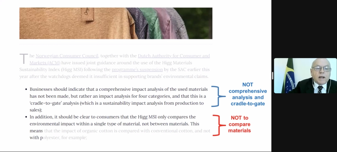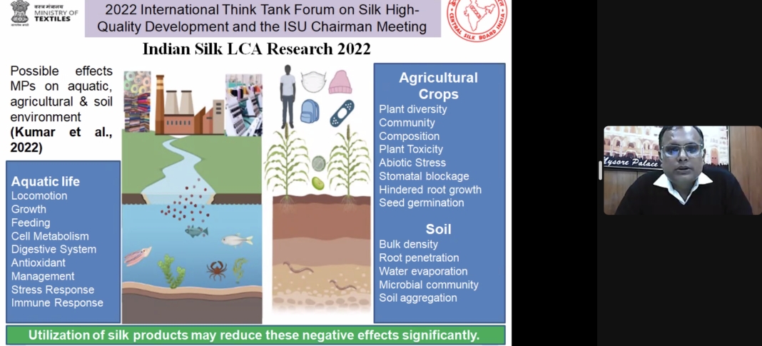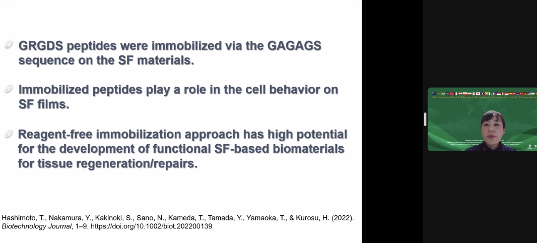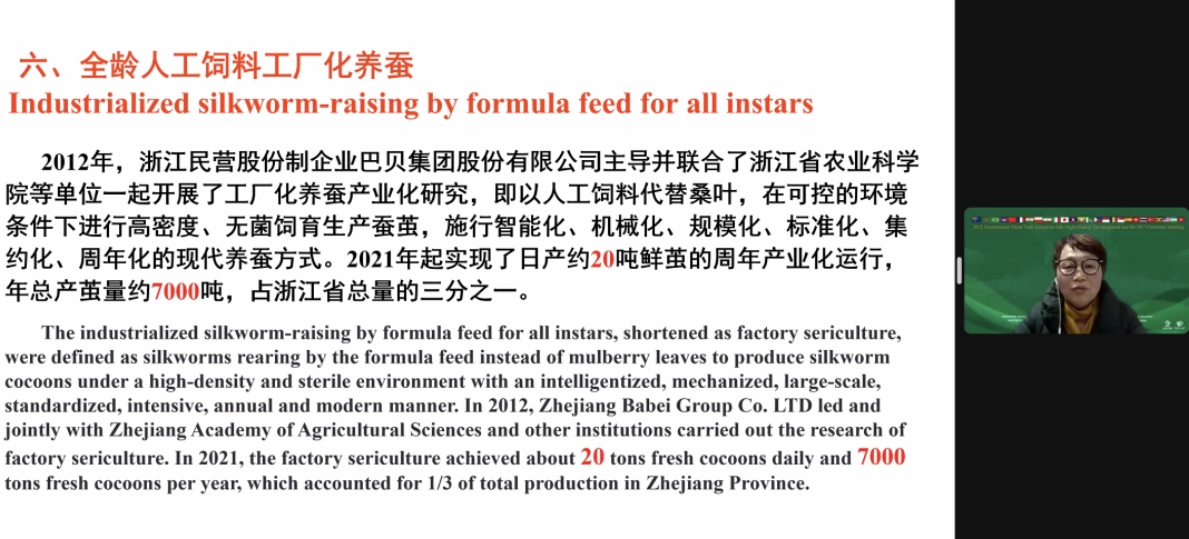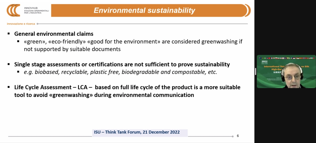 中國工程院院士、國際絲綢聯(lián)盟副主席、浙江理工大學(xué)校長陳文興及其項目助理分享了“中國絲綢產(chǎn)業(yè)高質(zhì)量發(fā)展研究及國際合作進展”;浙江省農(nóng)業(yè)科學(xué)院蠶桑與茶葉研究所研究員、國家蠶桑產(chǎn)業(yè)技術(shù)體系杭州綜合試驗站站長曹錦如分享了“全齡人工飼料工廠化養(yǎng)蠶的發(fā)展現(xiàn)狀及應(yīng)用推廣”;蘇州大學(xué)特聘教授、浙江凱喜雅集團絲素蛋白生物科技首席科學(xué)家王曉沁分享了“基于蠶絲蛋白的醫(yī)用生物材料研究及產(chǎn)品開發(fā)”;浙江大學(xué)國際經(jīng)濟研究所所長顧國達(dá)分享了“近代世界生絲市場的貿(mào)易規(guī)模與市場結(jié)構(gòu)”;日本信州大學(xué)纖維學(xué)部副教授橋本 朋子分享了“生物活性肽在絲素蛋白基生物材料上的靶向固定”;意大利絲綢研究中心主任Graziano Elegir分享了“意大利絲綢生命周期評價研究進展”;巴西絲綢谷項目負(fù)責(zé)人Joao Berdu分享了“2022年ISC和ISU與歐盟委員會環(huán)境總局的對接”;印度中央蠶絲局中央蠶業(yè)研究培訓(xùn)院研究員Amit Kumar 分享了“印度絲綢生命周期評價研究進展”;蘇州大學(xué)副教授許建梅分享了“絲綢產(chǎn)品全產(chǎn)業(yè)鏈生命周期評價:方法與實例”;浙江理工大學(xué)教授王來力分享了“絲綢產(chǎn)品生命周期碳足跡核算與報告技術(shù)指南(征求意見稿)”。