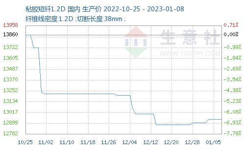 根據(jù)生意社價格監(jiān)測,上周(2023年1月2—8日)粘膠短纖價格微微上浮,截止至2023年1月8日,1.2D*38mm粘膠短纖國內(nèi)地區(qū)出廠報價為12940元/噸;較上周價格上漲40元/噸。 人棉紗價格弱勢平穩(wěn),截止至2023年1月8日(30S,環(huán)錠紡,一等品)出廠均價為17466元/噸,與上周價格持平。