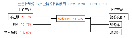 上周(2023年1月9—13日)上游端成本支撐,原料己內(nèi)酰胺現(xiàn)貨市場(chǎng)價(jià)格上漲,成本端支撐稍好,據(jù)生意社大宗榜數(shù)據(jù)顯示,1月8日國(guó)內(nèi)液體己內(nèi)酰胺市場(chǎng)均價(jià)為11233元/噸,1月13日國(guó)內(nèi)液體己內(nèi)酰胺市場(chǎng)均價(jià)為11766元/噸,較上周價(jià)格上漲533元/噸,周漲幅 4.74%。