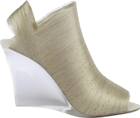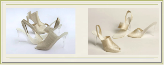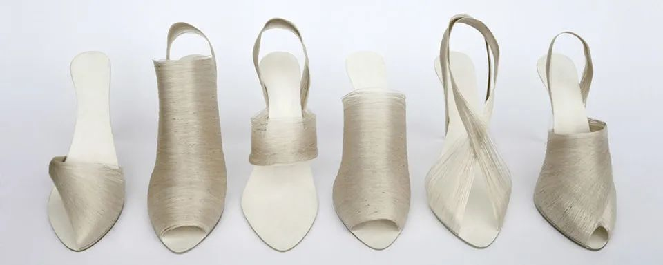 Nicole Goymann用繅絲工藝,將蠶繭經(jīng)沸水煮后會(huì)軟化,繭絲離解,可以抽出一根完整的絲線。通過在模型上纏繞絲線并控制方向,可以在鞋履設(shè)計(jì)中塑造出多種不同的形態(tài),設(shè)計(jì)出不同的款式。素絲外圍的蠶絲膠原蛋白(簡(jiǎn)稱絲膠)在接觸空氣千燥后會(huì)變硬且不會(huì)脫落。絲線的天然粘性和遇到空氣快速硬化的特點(diǎn)可確保不會(huì)變形。