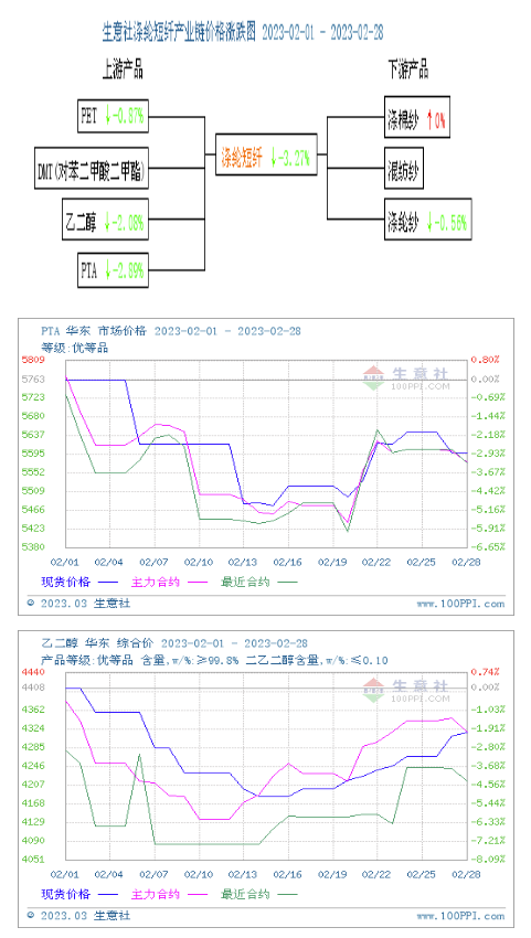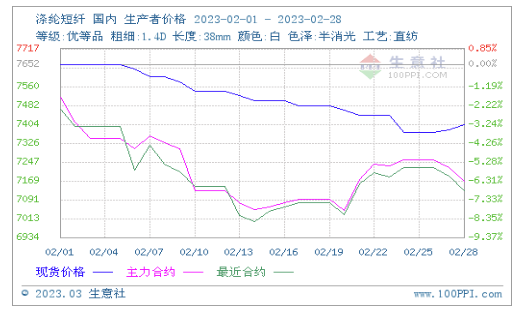 2月國內(nèi)滌綸短纖先抑后揚價格小幅下跌。據(jù)生意社價格監(jiān)測顯示,2月28日國內(nèi)滌綸短纖現(xiàn)貨出廠均價為7402元/噸,較月初價格7652下跌3.27%,同比下跌4.72%。期貨市場,月末短纖主力合約收于7212(結(jié)算價7166),較月初下跌3.45%。