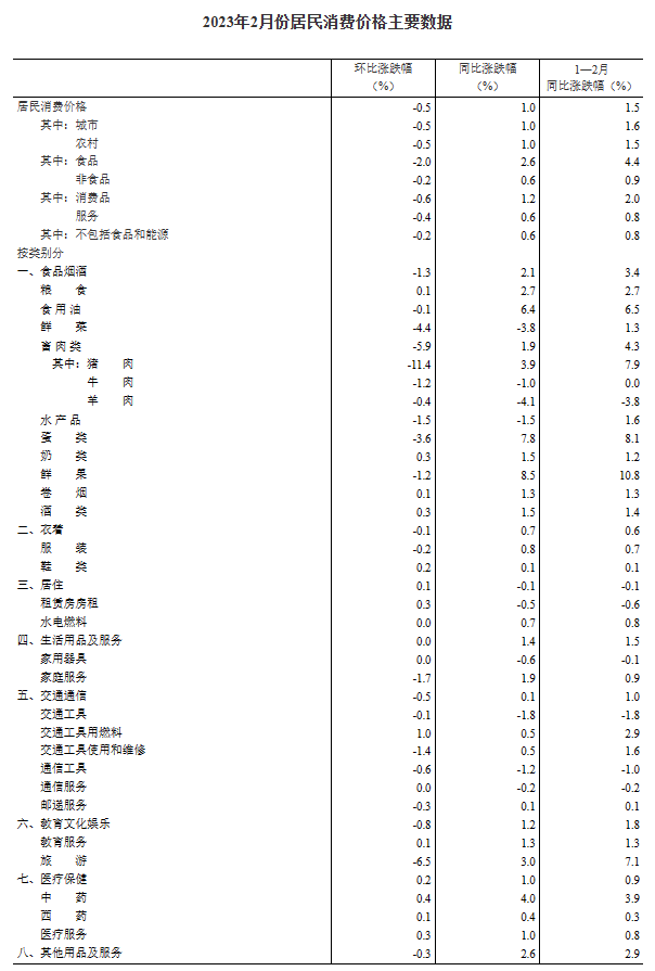 2023年2月份,全國居民消費(fèi)價(jià)格同比上漲1.0%。其中,城市上漲1.0%,農(nóng)村上漲1.0%;食品價(jià)格上漲2.6%,非食品價(jià)格上漲0.6%;消費(fèi)品價(jià)格上漲1.2%,服務(wù)價(jià)格上漲0.6%。1--—2月平均,全國居民消費(fèi)價(jià)格比上年同期上漲1.5%。