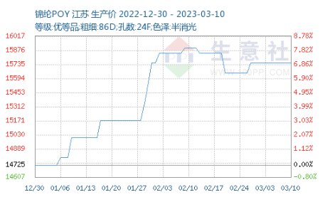 據(jù)生意社價格監(jiān)測顯示,上周(3月6—10日),錦綸長絲價格平穩(wěn),截止2023年3月10日,江蘇地區(qū)錦綸長絲DTY(優(yōu)等品;70D/24F)報價18020元/噸;錦綸POY(優(yōu)等品;86D/24F)報價15750元/噸;錦綸FDY(優(yōu)等品:40D/12F)價格報18750元/噸,均與上周價格持平。