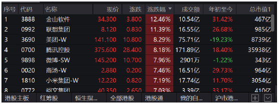 恒生科技指數(shù)(4198.99, 189.86, 4.74%)暴漲4.74%,金山軟件(34.3, 3.80, 12.46%)漲12.5%,聯(lián)想集團(tuán)(8.12, 0.83, 11.38%)漲11%,騰訊、美團(tuán)漲超8%,商湯、小米、閱文漲超7%。