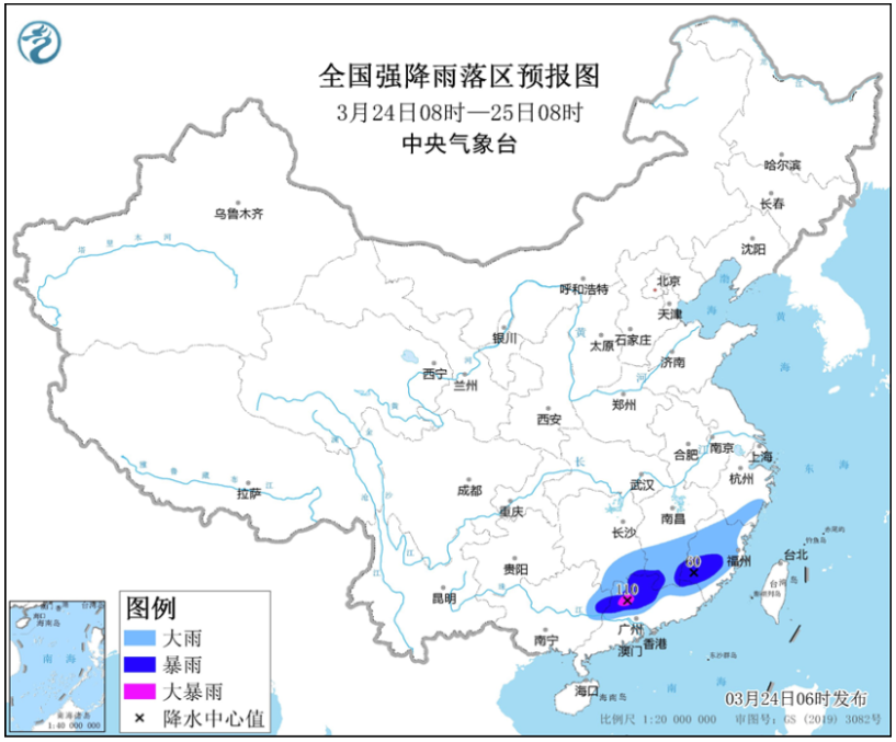 3月24日08時至25日08時,西藏南部、川西高原、青海東部、甘肅河西和東部、內(nèi)蒙古中部、山西北部、河北西北部等地的部分地區(qū)有小到中雪或雨夾雪,其中,青海東北部、內(nèi)蒙古中部、河北西北部等地局地有大雪。湖南東南部、江西中南部、浙江南部、福建大部、廣西東北部、廣東西部和北部等地的部分地區(qū)有大到暴雨,其中,廣東西北部等地局地有大暴雨(100~110毫米)。內(nèi)蒙古東部、遼東半島、浙江東部沿海等地的部分地區(qū)有4~6級風(fēng)。黃海大部海域、東海西北部海域?qū)⒂?~8級風(fēng),陣風(fēng)可達(dá)9級。