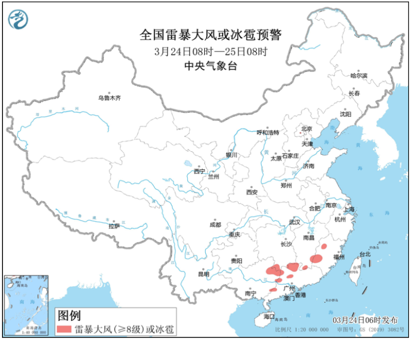 預(yù)計,3月24日08時至25日08時,湖南東南部、江西中南部、浙江南部、福建大部、廣西東北部、廣東西部和北部等地的部分地區(qū)有大到暴雨,其中,廣東西北部等地局地有大暴雨(100~110毫米)。上述部分地區(qū)伴有短時強降水(最大小時降雨量20~50毫米,局地可超過60毫米)。湖南南部、江西南部、福建西部、廣西東北部、廣東北部和西部等地的部分地區(qū)將有8-10級雷暴大風(fēng)或冰雹天氣(見圖1、圖2)。中央氣象臺3月24日06時繼續(xù)發(fā)布暴雨藍(lán)色預(yù)警和強對流天氣藍(lán)色預(yù)警。