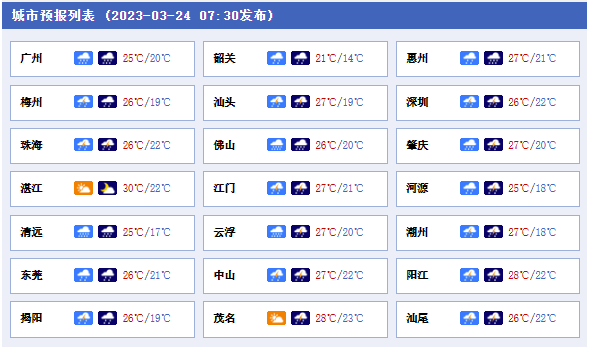 城市中,廣州今天白天陰天,雷陣雨轉(zhuǎn)大到暴雨,夜間陰天,有中到大雨,局部暴雨;氣溫介于22℃~26℃之間,相對(duì)濕度介于80%~98%之間,吹和緩的東南風(fēng)。