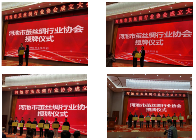 河池市委統(tǒng)戰(zhàn)部副部長、市工商聯(lián)書記 潘冬梅為協(xié)會會長授牌,廣西繭絲綢行業(yè)協(xié)會賴以軍會長為常務副會長授牌,河池市工信局唐濤副局長為協(xié)會副會長授牌,河池市民政局覃鋒副局長為協(xié)會理事授牌。