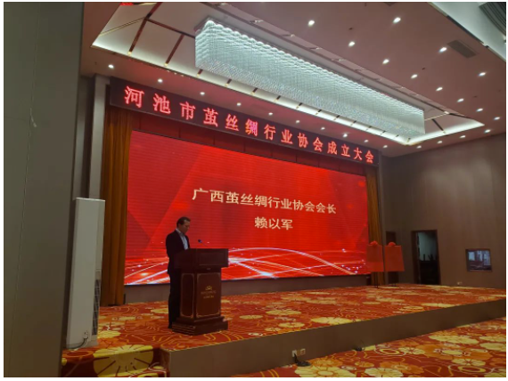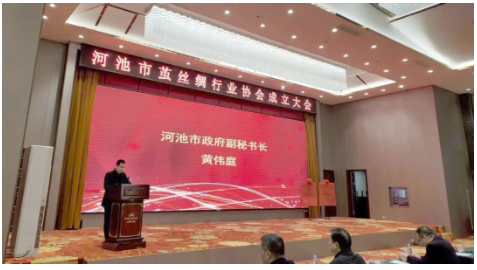 河池市政府副秘書長黃偉庭致辭。他說,在見證河池市的繭絲綢行業(yè)跨入一個新的發(fā)展時期的歷史時刻,在此,受陸景宇副市長委托,謹代表河池市人民政府向河池市繭絲綢行業(yè)協(xié)會成立大會勝利召開致以熱烈祝賀。眾所周知,桑蠶繭絲綢產(chǎn)業(yè)在河池發(fā)展優(yōu)勢明顯,河池市桑園面積、鮮繭產(chǎn)量、生絲產(chǎn)量均連續(xù)多年穩(wěn)居全國地級市首位,是中國蠶桑之鄉(xiāng)、中國優(yōu)質(zhì)繭絲生產(chǎn)基地、廣西蠶桑重點生產(chǎn)基地。近年來,廣西河池市牢牢抓住“東桑西移”戰(zhàn)略機遇,圍繞打造千億桑蠶繭絲綢產(chǎn)業(yè)集群目標,推動絲綢全產(chǎn)業(yè)鏈實現(xiàn)高質(zhì)量發(fā)展,形成了“世界桑蠶看中國、中國桑蠶看廣西、廣西桑蠶看河池”的發(fā)展格局,獲中國絲綢協(xié)會授予“中國絲綢新都”稱號。