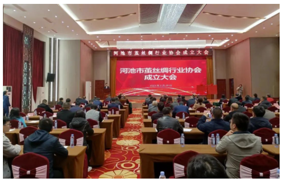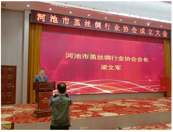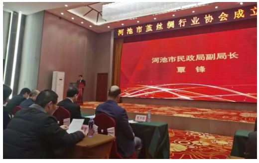 河池市委常委、統(tǒng)戰(zhàn)部部長梁仁省,河池學院副院長賀衛(wèi)國,河池市人民政府副秘書長黃偉庭,中國絲綢協(xié)會副會長、廣西繭絲綢行業(yè)協(xié)會會長賴以軍,廣西自治區(qū)蠶業(yè)推廣站副站長韋偉,南寧海關技術中心所長高俊,河池市宜州區(qū)委常委、統(tǒng)戰(zhàn)部部長、副區(qū)長樊仲宇,環(huán)江毛南自治縣人民政府副縣長唐鍔,河池市工商聯(lián)、工信局、民政局、財政局、農(nóng)業(yè)農(nóng)村局、市場監(jiān)管局、商務局、市城投、市國投、市產(chǎn)投公司等市直單位相關領導,廣東絲綢協(xié)會秘書長藍年新,廣西繭絲綢行業(yè)協(xié)會秘書長肖雪峰,四川省絲綢協(xié)會代表卜獻鴻,安徽省絲綢協(xié)會代表金小軍,河池市相關金融機構(gòu)代表,河池市繭絲綢行業(yè)協(xié)會65家會員單位代表,河池周邊縣市繭絲綢加工企業(yè)約20家企業(yè)代表,相關企業(yè)代表等100多人出席會議。